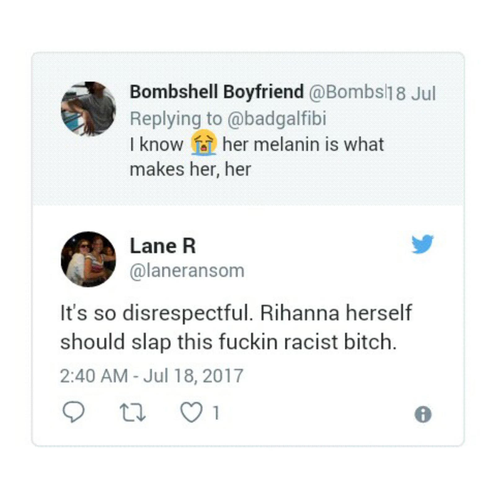 Hundreds of social media users hit back at the tweet and voiced their disapproval, calling the light-skinned uploads “disrespectful” and “racist.” “It’s so disrespectful. Rihanna herself should slap this f***** racist b****,” a user wrote. “And you’d look so much more beautiful if you didn’t have an opinion,” another user hit back following her comments about Rihanna, while another user wrote in response, “Twitter would look so much more beautiful if you weren’t in it.”